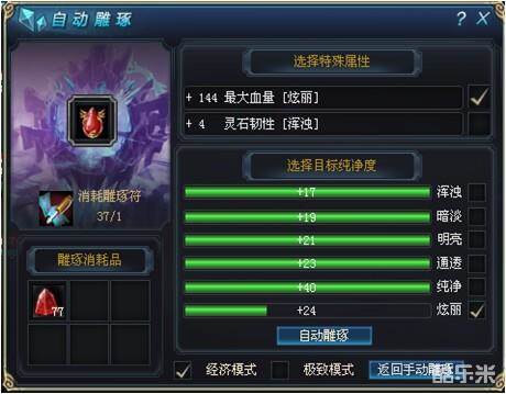 3)雕琢会失败或成功,且雕琢档次及次数较多,为方便玩家达到所需档次,增加了“自动雕琢”,如下图。直接勾选某个档次,放入足够的雕琢符、下品宝石或宝石精华。其中“经济模式”即每个档次雕琢2次,“极致模式”每个档次直接雕琢3次。