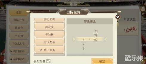 玩家可以选择组队界面右下方的创建队伍。可以进行目标等级筛选条件设定,点击“确定”就可以创建队伍了,值得一提的是小窗口左下方会提示是否发布招募,如果√亮起则表示向世界玩家发布队伍创建信息,反之则不发布。