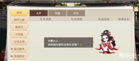 队伍界面还可以切换大厅、同盟、好友不同频道的队伍信息,方便玩家查看。当玩家选定目标并申请加入某一个队伍,队长同意后,将会被直接传送至队长所在位置,则组队成功。