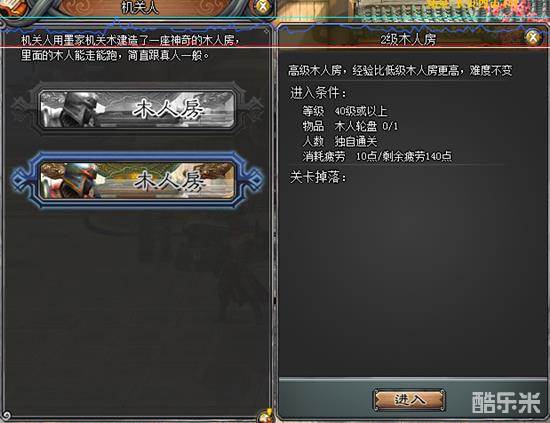 拥有木人轮盘后即可在机关人处点击“进入关卡”来选择木人房玩法关卡,木人房有两种难度,30-39级时只能选择低级木人房进入。40级以上只能进入高级木人房,高级木人房难度不变,但最后会多出2波隐藏关卡,且经验奖励倍数更多。
