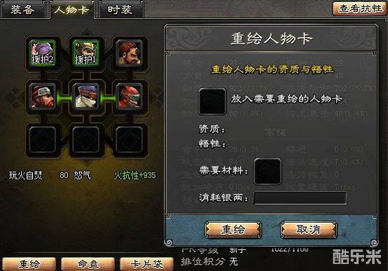 点击人物属性-人物卡面板上的“重绘”按钮,可以打开重绘界面。将需要重绘的卡片拖曳到卡片框中,同时需要商城道具“传神画纸”和10000银两,就可以重绘这张人物卡。重绘同时重置该人物卡的资质和悟性,受到资质和悟性影响的战斗数值大小也会随之更改。其他数值(比如等级等)均不会重置;