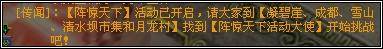 2.玩家可在成都城【366.100】处及其他主要城镇找到NPC守阵人【阵惊天下活动大使】,并到该NPC处领取BUFF【灵气护体】然后进入对应的阵法。