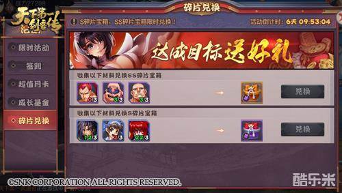 比原作更绚丽、更强大的必杀技,就在《天下第一剑客传》!现在还有达成目标送好礼活动,只要收集齐少量指定剑客碎片,即可兑换S或SS碎片宝箱一个,活动还有5天截止,赶快去收集碎片吧!