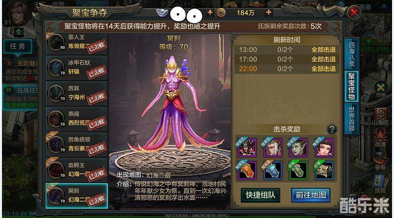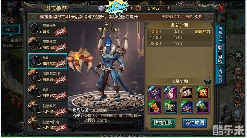聚宝怪限时活动的参与形式是以氏族为单位,最低等级限制为50级开启该活动界面,活动时间为每天固定刷新时间13点、17点、22点这3轮刷新时间。每轮限时半小时,半小时内击杀所有聚宝怪即为本轮结束,超过半小时无论是否成功击杀聚宝怪,幸存聚宝怪均自动退出地图亦为本轮结束。同一个氏族每天只有前五次击杀可获得奖励。聚宝怪的能力会根据服务器开启的时间逐渐提升变动,奖励也随之提升变动。服务器上限104级时聚宝怪的个数由原来的15只调整为目前的18只,分别刷新在有PK善恶值地区:昆仑、海市蜃楼、琅琊盆地、轩辕、宁海州、西烈荒原、巨人野、暮秀雨林、伏羲陵密道、药王殿一、七迷洞一、幻海一、炼骨窟一;PK无善恶值地区:药王殿二、七迷洞二、幻海二、炼骨窟二、伏羲陵;每张图会有不同2~3个数量的刷新点随机刷出1只聚宝怪。注:有些等级上限例如(89级、94级、99级)的时候某些地图会同时刷出2只聚宝怪哦!