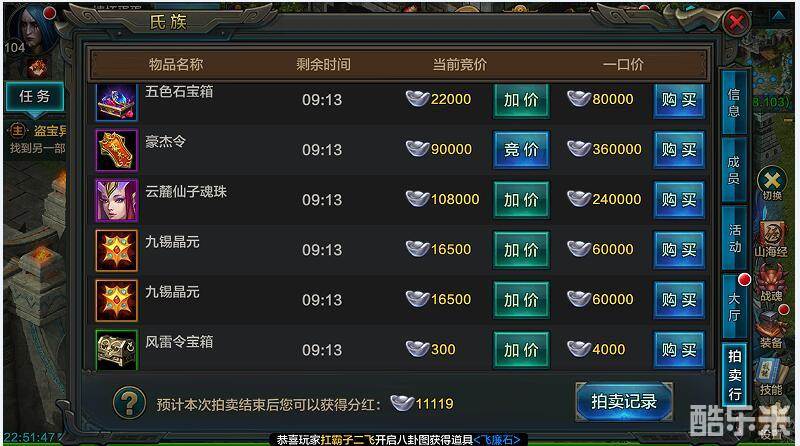 第二种是氏族拍卖奖励,氏族拍卖奖励是由击杀获得归属权的氏族成员进行拍卖,参与本轮活动的氏族成员有分红,未参与的话只能眼馋啦。蛋蛋在这温馨提示一下各位老铁,接风雷后一定不要忘了按自动攻击哦,被罚站可就尴尬没分红叻呢!氏族拍卖的奖励也是非常丰厚的,有各职业5档武器、防具的打造图鉴、九锡晶元、相应阶段等级的紫色战魂珠和低/高级战魂技能书等奖励,氏族所有正式及以上成员均可以参与竞价拍得(见习成员没有参与权),而参与聚宝怪活动的成员则能获得拍卖所得分红银两。