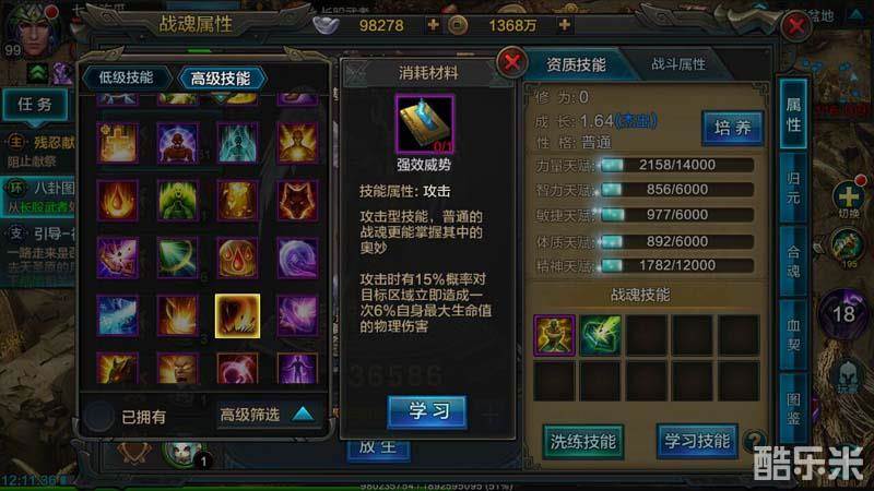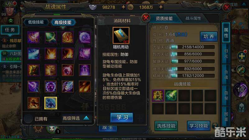 在旋龟的天生技能中,强效魂灵、强效魂甲和强效魂元都是体质型战魂必备的被动技能,能够增加生命值、物理防御和法术防御。在被动防御技能中,强效钢骨和强效硬皮也是很适合旋龟的被动技能,旋龟不需要输出技能,如果要学习输出技能的话,可以选择强效威势,强效威势与专属技能随机而动的效果相似,都是对目标造成自身最大生命值一定比例的伤害,另外也可以选择一些状态和辅助类技能,在战斗的时候能与主人进行互动。
