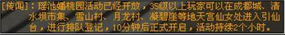 2.玩家可在成都城“活动专区”【381.135】及其他主要城镇处找到天宫仙女,通过天宫仙女传送进入瑶池蟠桃园引仙台(与引仙台内天宫仙女对话将被传送回凝碧崖),引仙台与蟠桃园内不可PK、不可摆摊;