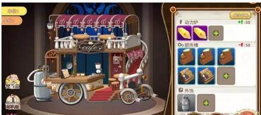 [配件]:提升餐车属性,提高餐车营业的收益,需要消耗动力。所有配件的基础属性和额外属性都是随机的。分解配件可以获得配件强化材料。