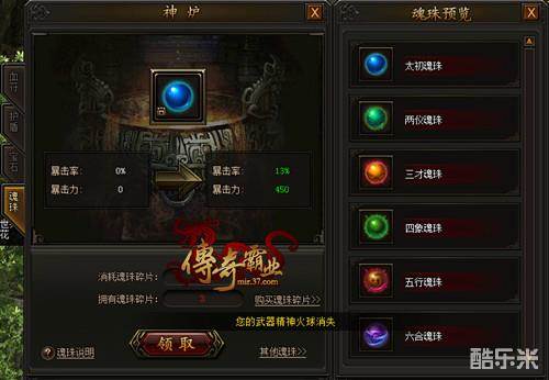 魂珠是37《传奇霸业》特殊装备之一,其特殊点在于魂珠的属性,在所有装备中,魂珠是唯一带有暴击属性的,所谓的暴击属性主要分为两个方面。第一就是暴击力,也就是出现暴击之后额外打出的攻击力,第二就是暴击率,也就是大怪出现暴击的几率,而我们在游戏中不断的提升魂珠,这两个属性是同步增加的。