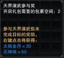 | 天界演武参与奖礼包 | 太极金丹30个 |