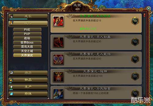 天界演武成就:当玩家在天界演武战场中完成某些荣誉将会获得相应的成就。