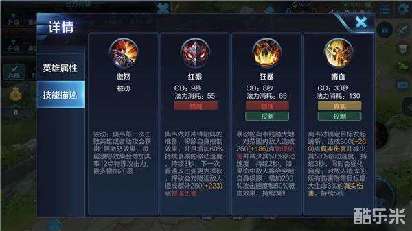 被动技能——激怒:被动技能让肉装典韦到了中后期也也有不俗的伤害输出,在实战中典韦要积极游走参战,从而利用助攻或击杀累加物理攻击力。