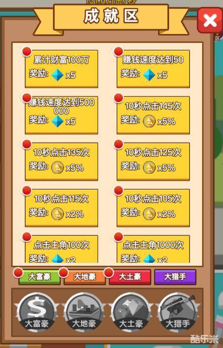 此成就主要包含主角点击+赚钱速度+累计财富 组成,作为首富,大富豪成就将会是最容易获得的称号。