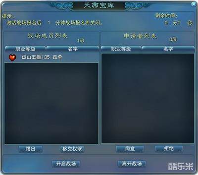 当玩家激活天地宝库场景后,将有2分钟报名进入时间,其他玩家可以申请进入。而激活天地宝库的人可以接受申请者加入或者踢出已经在列表内的玩家。当点击【开启战场】后,所有参加成员将传送至天地宝库地图内。