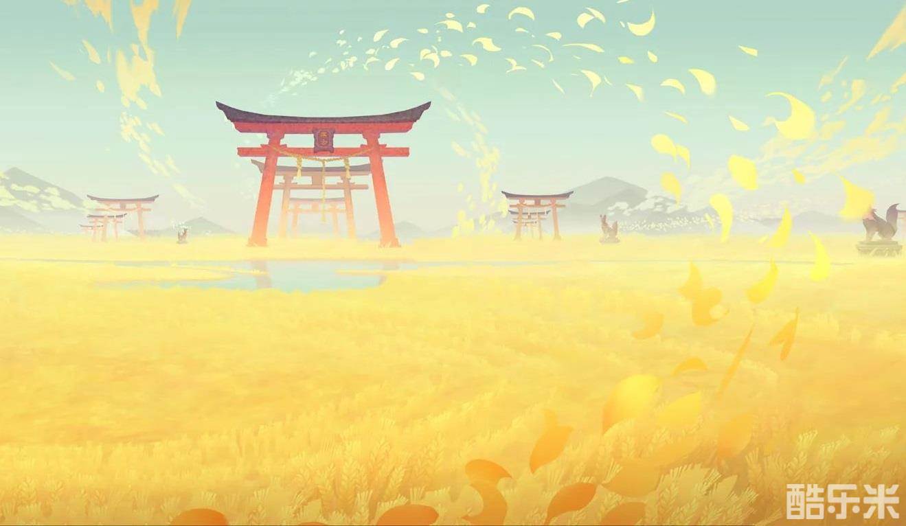 晴空蔚蓝如洗,旷野安谧,偶有几声鸟啼。风掠过,拂起访者洁白的云袖。一声狐鸣,宣告着神社主人的归来。鸟居朱红一如往昔,金色麦浪耀眼如初。御馔津微笑着环视这熟悉的一切,过往的记忆慢慢涌至眼前。
