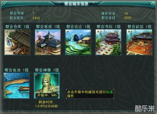 玩家可以在帮会管理界面打开城市信息查看帮会城市的升级情况,并可点击加速按钮来加速当前正在建设的建筑。