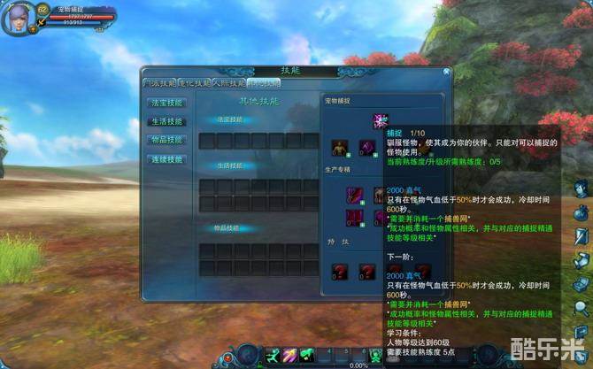 捕捉宠物会有一定的成功率,不管是捕捉成功还是捕捉失败,都会提升一定的捕捉熟练度。当捕捉熟练度到达当前捕捉等级上限后就可以升级捕捉技能。升级后的捕捉技能在捕捉成功率上会有很大提升。