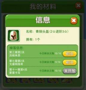 就是升级卡片的颜色同时增加卡片的攻击 时间加成 和等级上限,如图2星白卡升级为3星绿卡,需要一套青铜套装,同理绿卡进化到蓝卡就需要蓝色套装,之后就是蓝色+1 需要同等蓝色卡片(等级1级以上都行)+2就是两张同等蓝卡,+3就是三张,之后升级紫卡就是一套黄金套装,不过比较难得了。接下去就是紫卡+1+2+3如果不知道在哪里打,可以点击头像,会显示掉落关卡。
