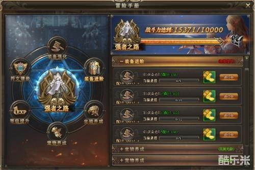 界面左侧展示可养成的选项,包括等级提升、符文镶嵌、装备强化、装备进阶、坐骑养成、宠物养成,点击相应图标则在右侧展示相应养成成就选项