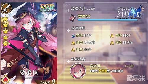 萝莱拉的必杀技“恋之锤”对前方大范围敌人造成伤害,初始倍率2022%,每级成长18%,满级可达到3620%。并且大招是一段伤害,不像目前的其他SSR一样是多段伤害,这是一个隐藏的优势,当60级获得满血必暴击的手套时,会得到质的提升。