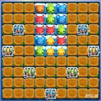 2、棋盘上有六个牢笼,均需要匹配消除两次才能清除,躲在木箱中间很难清除。但其下方有冰块存在,且牢笼中都是旋风小丑,所以有机会还需尽早消除它们。再使用这几个旋风小丑,可以帮助我们快速扩大匹配空间或消除冰块。