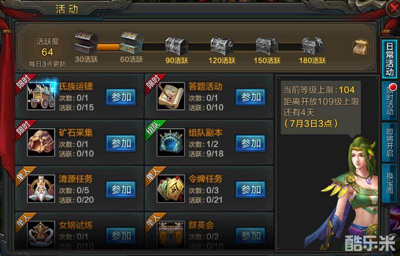 在100级以上升级时,每天的180点活跃值任务是必不可少的,日常任务可以按照先单人后队伍的顺序来做,先做一些答题任务、八卦图、群英会、女娲试练等单人任务,组队副本、降妖伏魔、校场训练和地下城试炼任务需要组队完成,组满5人可以享受到20%的队伍经验加成。清源任务和令牌任务也是单人任务,但是需要刷的怪物数量较多,如果组队去刷的话可以节省时间。
