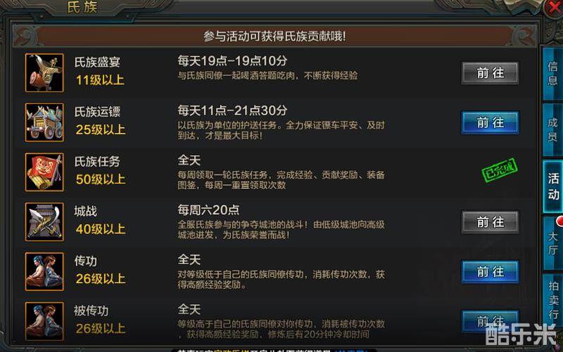 氏族活动任务都是限时任务,每天的2次九黎入侵和1次氏族盛宴,完成后都可以获得大量的经验。在晚上19:00开启的氏族盛宴、19:10的九黎入侵和氏族押镖一般是连起来做的,氏族任务不仅奖励活跃值,而且都有非常丰厚的经验。聚宝怪物、世界首领等玩法虽然不奖励经验,但是会获得各种稀有道具奖励,这样活动也是以氏族为单位进行的,也是每天不可错过的氏族活动玩法。