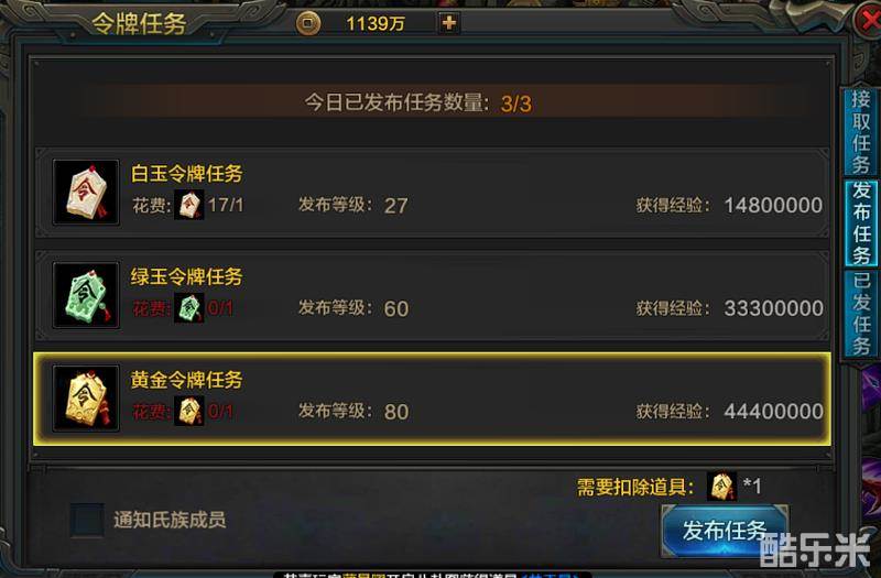 在令牌任务中,发布黄金令牌任务获得的经验最多,而购买黄金令牌所需的氏族贡献也是最多的,可以暂时放弃发布黄金令牌任务,换成发布绿玉令牌任务。绿玉令牌的成本只有黄金令牌的三分之一,获得的经验并不比黄金令牌少多少,可以省下氏族贡献用来学习氏族技能。