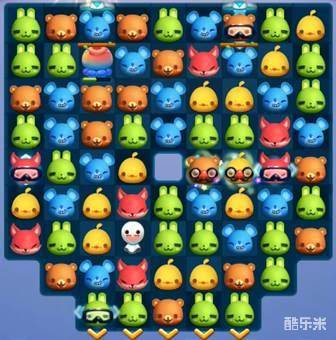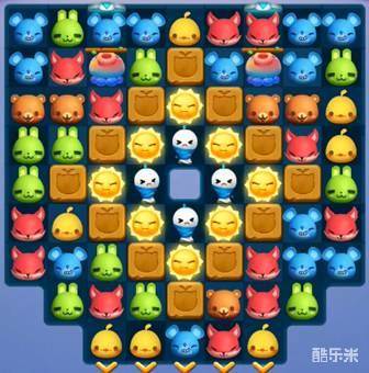 1、本关的棋盘较为完整,只有正中间被缕空了一格,但是棋盘上的障碍物较多。我们开局需要先消除棋盘上的障碍物,扩大我们的匹配空间,才能更容易的完成过关任务。所有障碍物中,木箱是最容易消除的,所以我们开局先仔细观察,寻找机会消除这些木箱。
