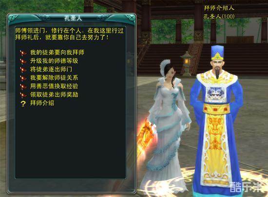拜师时,两个人需要单独组队前往,两人必须是好友关系,而且不能是夫妻关系和结拜关系。到长安 孔圣人(1184,946)处对话。