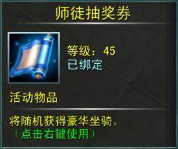 当徒弟等级达到45级时,就可以去长安孔圣人处领取一张师徒抽奖卷。每出师一个徒弟,就可以领取一次。在长安孔圣人处,选择领取徒弟出师奖励项。