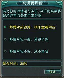 当玩家到达奖励的等级(30、45、60、70、80级)时将会弹出一个界面,要求玩家对师傅的态度做出评价。