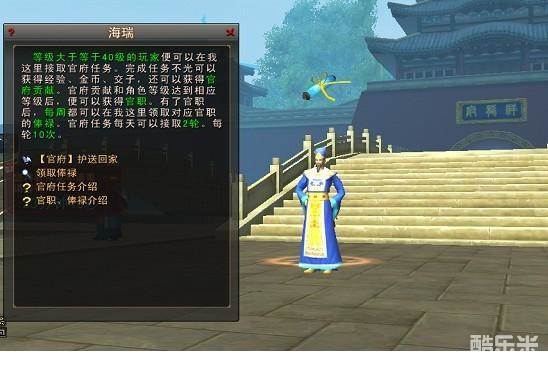 等级大于等于40级的玩家便可以在我这里接取官府任务。完成任务不光可以获得经验、金币、交子,还可以获得官府贡献。官府贡献和角色等级达到相应等级后,便可以获得官职。有了官职后,每周都可以在我这里领取对应品阶的俸禄。官府任务每天可以接取2轮。每轮10次。