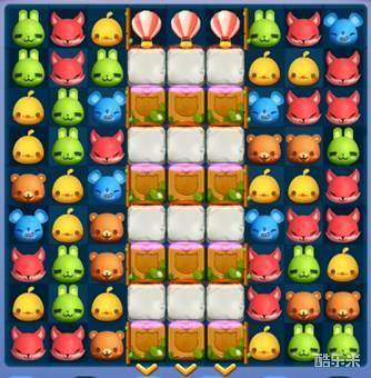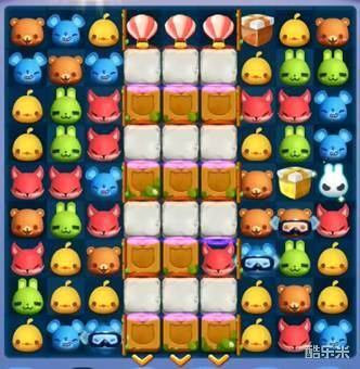 2、栅栏不仅阻碍了热气球的交换移动,还阻挡了我们消除热气球的机会,中间的热气球非常难以攻击到。所以我们需要在棋盘左右两侧,棋子分布密集的区域,尝试连取横向的目镜射线,直接使用目镜射线攻击同行的木箱。此外,棋盘上方的木箱消除机会较少,有机会需优先消除掉它们。