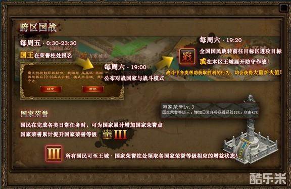 报名时间:跨区国战开始时间为每周六19:20,任意国家国王可在每周五00:30-23:30期间,在本国“国家荣誉柱”处报名。每个国家每周只可报名一次。系统将根据实力匹配一个对手。匹配结果将在比赛日19:20公布。