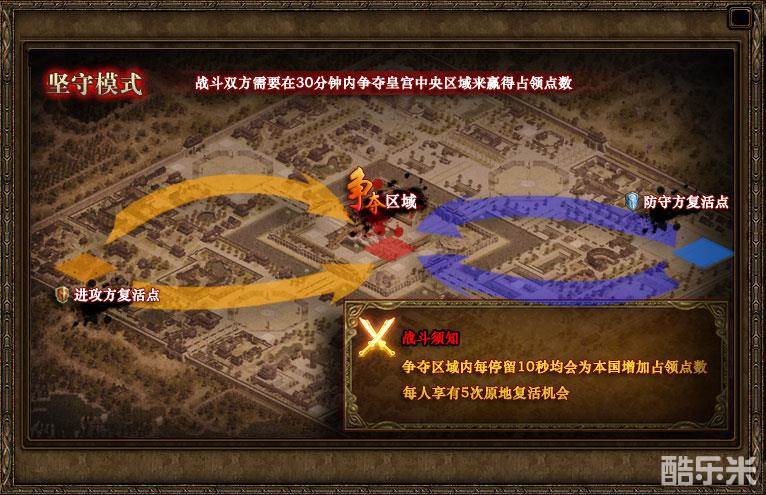 进攻方复活点与出发点为防守国王城西北角,防守方复活点与出发点为王城复活区。比赛开始后,战斗中玩家都有5次原地复活机会,死亡超过5次后将返回本方复活点。