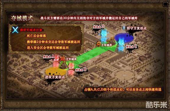 进攻方从王城西门安全区出发,防守方从王城东门安全区出发。战斗开始时,系统将自动将防守方王城参战双方全体成员传送至相应出发点。战斗中玩家都有5次原 地复活机会,死亡超过5次后将返回本方复活点。开战后,防守国王城内会出现两座军械库。双方军械库初始均有3000个军械,参战双方需要从对方军械库内搬 运军械至自己的军械库上交。玩家需在2分钟内完成军械搬运,如2分钟内未将偷来的军械交回已方军械库,则搬运失败。比赛30分钟后,军械库内存有的军械最 多的一方获胜。