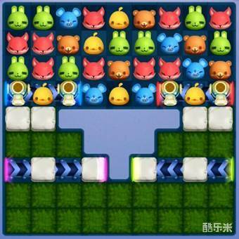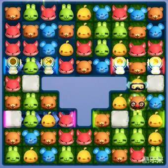 1、开局可以看到,棋盘的中间有一处较大的缕空格子,旁边还有石头阻碍,将棋盘分成了上下两个区域。下方区域的棋格大部份已经铺设了草坪,但没有棋子存在。所以我们想要延伸草坪,就必须先在大炮旁边进行消除,触发大炮攻击消除石头,才能让上方棋子掉落到下方,才能进一步通过匹配交换延伸草坪。