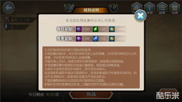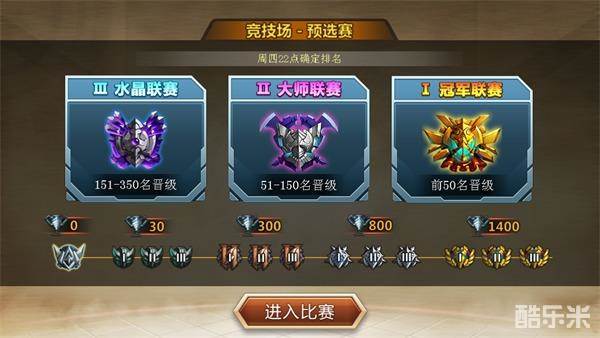 玩家通过竞技获得积分和钻石奖励,并在每天晚上22:00根据当前杯段(积分越高则杯段越高)获得竞技场币、装备升级石和大量金币奖励,奖励将以邮件的形式发放,其中珍贵的竞技场币可用于在竞技场商店中兑换英雄基因等丰富奖励噢!