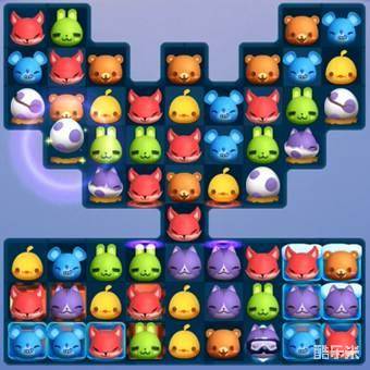 1、开局观察棋盘,可以发现棋盘中间被切割了一部份,棋盘被分成了上下两个区域。我们的主要任务有两个,收集小火车和消除紫色棋子。首先,小火车都躲在冰块下方,而冰块都集中在棋盘下方区域,我们只要集中消除棋盘下方的冰块,就能找到并收集小火车了。