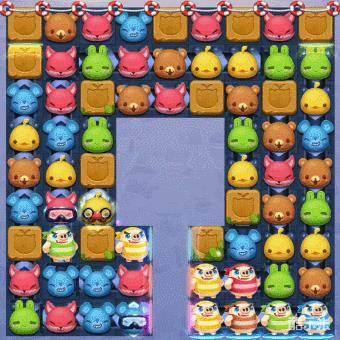 1、本关的主要任务是收集水手猪,而水手猪会在棋盘右下角的光圈处出现,我们直接匹配消除即可收集它们。不过棋盘中的木箱障碍物非常多,较为影响我们匹配消除。正所谓,磨刀不误砍柴工。我们开局先将棋盘中的大部份木箱消除,扩大匹配消除空间,为后续更快的收集水手猪打下基础。