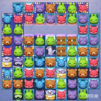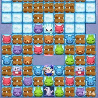 2、棋盘下移后,棋盘中存在大量木板,且木板下方也有雪块存在。我们想要更快的消除雪块,就必须先将木板消除。由于这时的棋盘中有木匠猪和爱斯基摩猪存在,障碍物的消除并不轻松。所以在就近消除的同时,我们还要找机会制造特殊棋子使用,加速障碍物的消除。