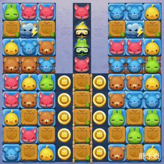 3、本关的步数并不多,在收集时尽量靠近棋盘下方消除,利用棋子的下落顺带收集棋盘上方的kitty即可。此外,在收集期间,我们还要尽量制造特殊棋子,并将它们进行组合使用。利用特效组合的大范围消除,可以让我们更快的消除冰块收集kitty。