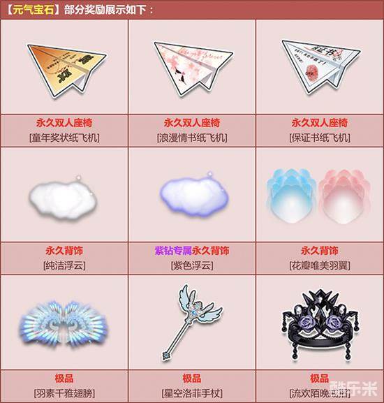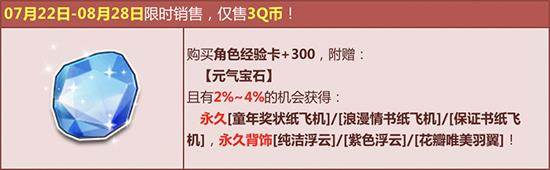 7月22日-8月28日,购买角色经验卡+300,赠送【元气宝石】,有机会得永久【童年奖状纸飞机】/【浪漫情书纸飞机】/【保证书纸飞机】,永久背饰【纯洁浮云】/【紫色浮云】/【花瓣唯美羽翼】!或其他奖励之一!其中核心极品期限型概率范围为:4%-6%,核心奖励永久型概率范围为:2%-4%,非核心奖励概率范围为:90%-94%。