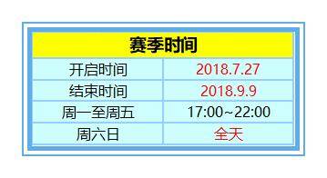 2018.7.27-2018.9.9,S6新赛季激情进行!周一至周五的开放时间为17:00-22:00,周六周日全日开放哦!要上分的朋友们赶紧约起来~~~