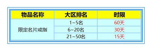 各大区竞技榜前五十名玩家都能获得专属排名奖励限定名片戒指!展示非凡的魅力~