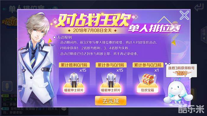 在对战中心里,平时也是有活动可以参加的。“对战狂欢”活动就是在对战中心中特有的活动。活动会随机出现在这几个对战模式中,还可以拿到非常免费的服饰碎片作为奖励!今天登录游戏的时候我看到在单人排位赛中出现了对战狂欢活动,所以是一定要去比赛的,比赛以前三场成绩作为活动目标,简单说,完成三局对战,只要赢得一场就可以顺利拿到服饰碎片啦!