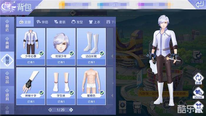 在之前参加对战狂欢活动的时候,我也积累了很多“喵星绅士”碎片,今天又获得了一些碎片,所以我在工坊中也终于集齐了一整套新服饰。大家来看我这一身,都是由“喵星天使”碎片合成的:“少年心事”套装、“犹豫少年”发型、“洁白长靴”,上衣以银色为主,修身干练,裤子是咖啡色的,搭配洁白的长靴,深浅对比分明,这一身搭配还是比较帅气的,最重要的是,这可是一套免费服饰哦!