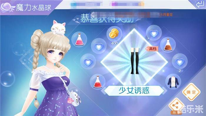 在魔力水晶球中抽奖时,如果免费次数用掉后,可以花费100点券来进行抽奖,在“物品一览”中,可以看到在魔力水晶球中可以抽取到的道具奖励,幸运的欧皇则会获得一些高档服饰,是不是非常具有诱惑力呢?当大家在查看奖励服饰的时候,点击服饰可以看到试穿效果哦!