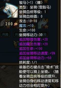 坐骑的属性包含血统等级、血统数值、物理攻击、魔法攻击、生命上限、坐骑的移动速度、坐骑移动力。